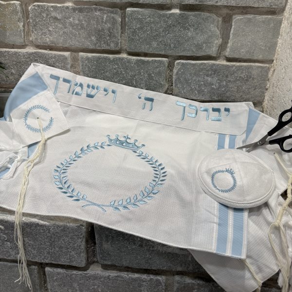 *טלית מהודרת מבד תשבץ עם רקמה "עלים" ועטרת מעוצבת בתוספת רקמת שם הילד.