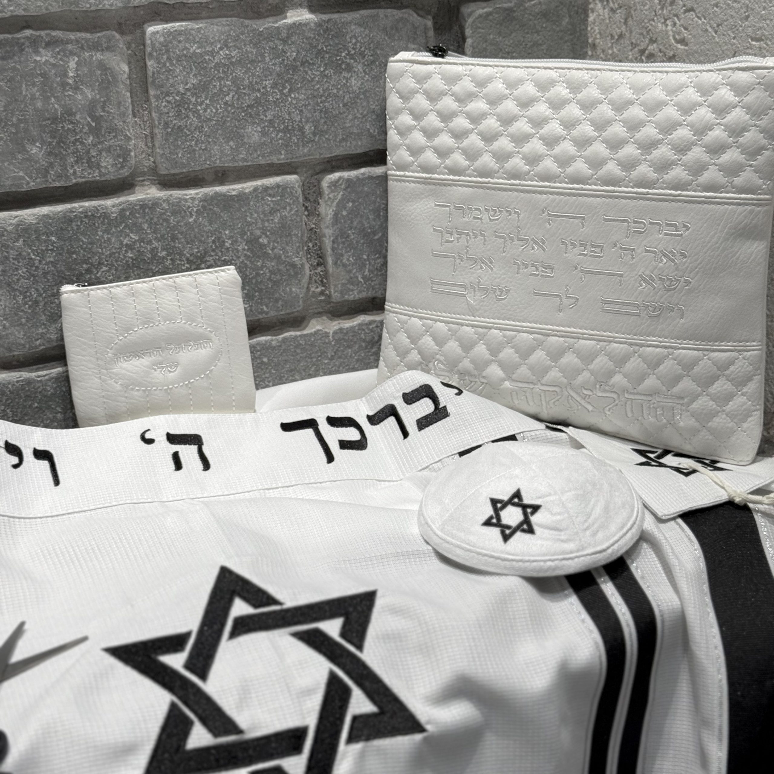 * תיק דמוי עור לבן רקמה "החלאקה שלי" עם ברכת הכהנים רקמת השם.