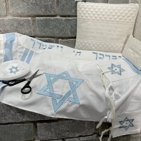 *טלית מהודרת מבד תשבץ רקמה מגן דוד ועטרת מעוצבת ברכת כהנים בתוספת רקמת שם הילד.