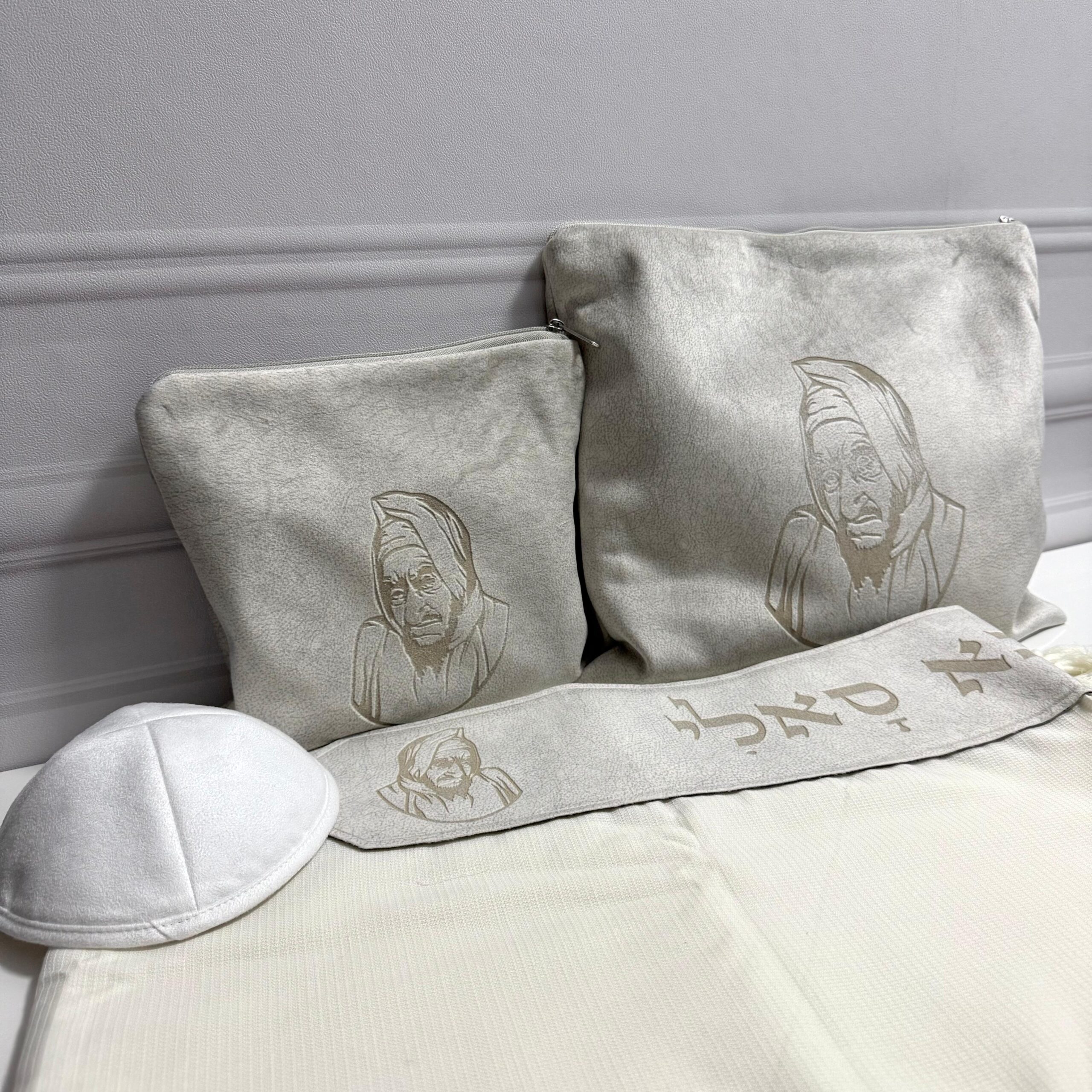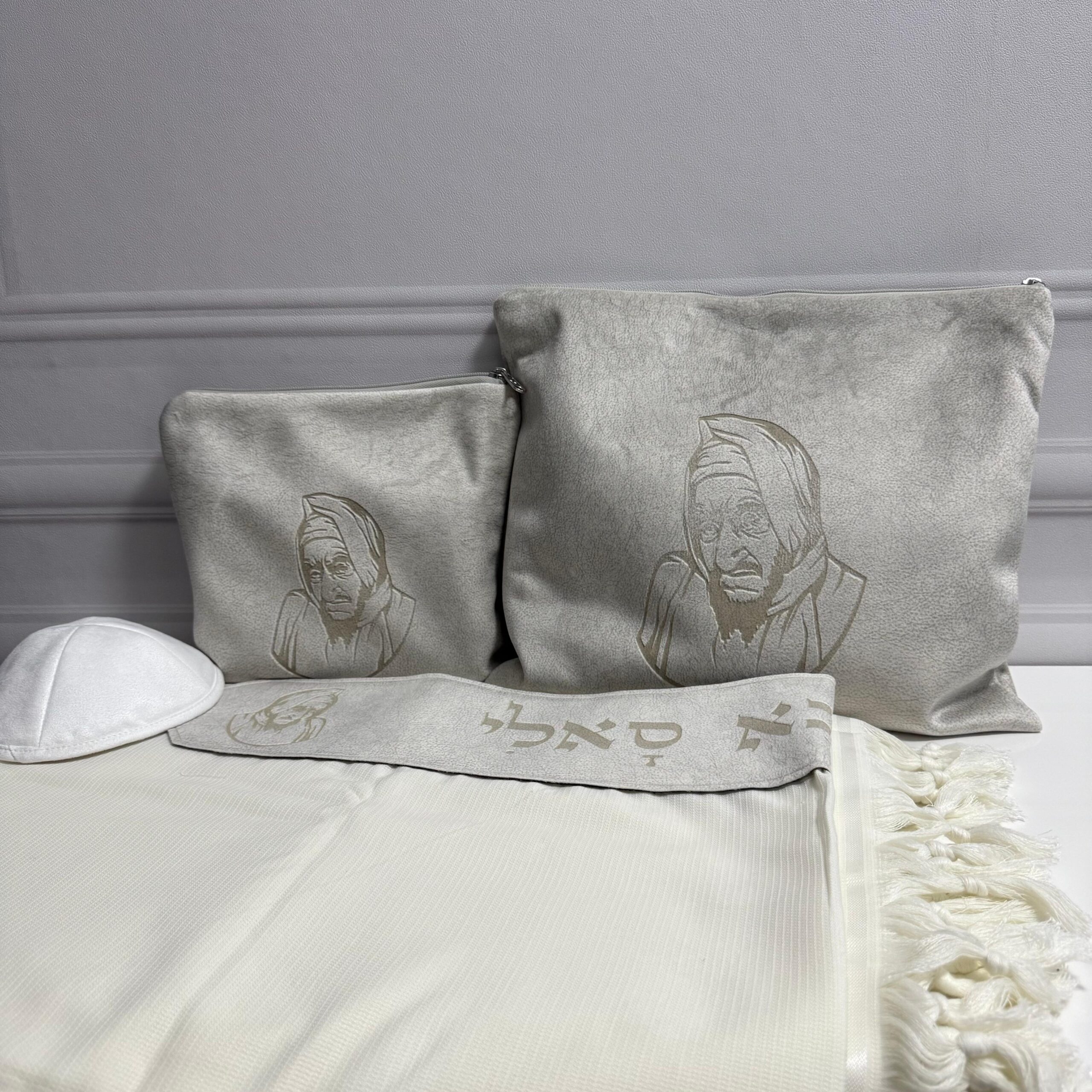 – סט כיסויים לטלית ולתפילין קטיפה-זמש בבא סאלי בתוספת רקמת שם.