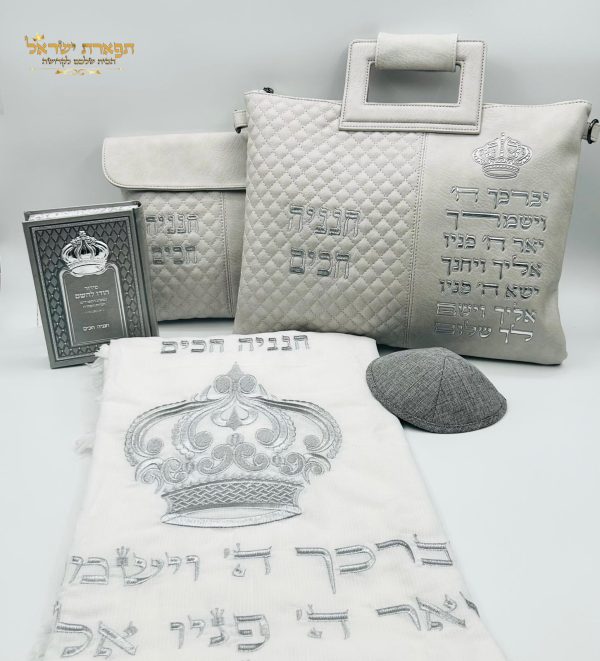 – סט תיקים לטלית ולתפילין דמוי עור אפור הבלטה "ברכת הכהנים" כתר תורה כסוף בתוספת רקמת שם.