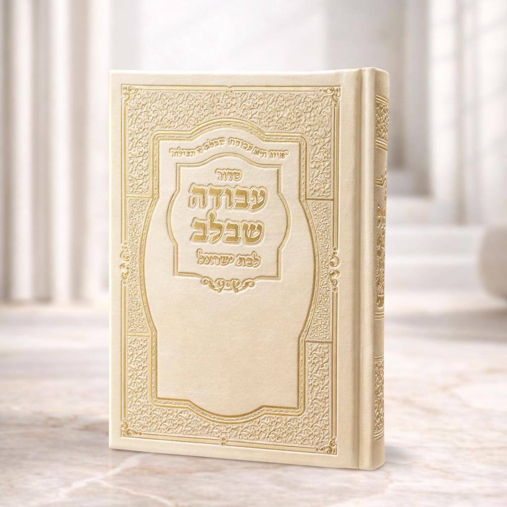 סידור תפילה מהודר העשוי מכריכת דמוי עור בצבע שמפניה ודפים זהב מסביב.