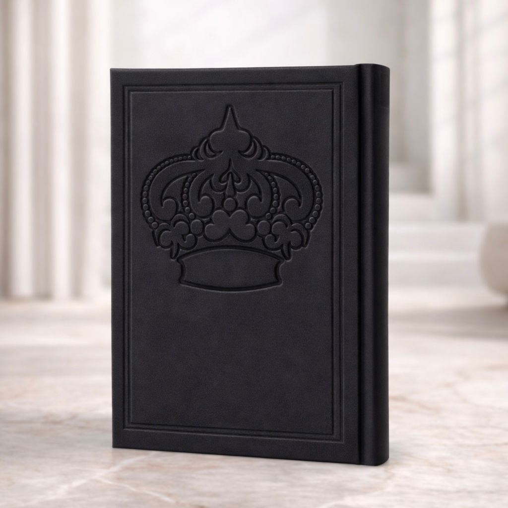 עשוי דמוי עור בגוון שחור, עם חריטה של כתר תורה.