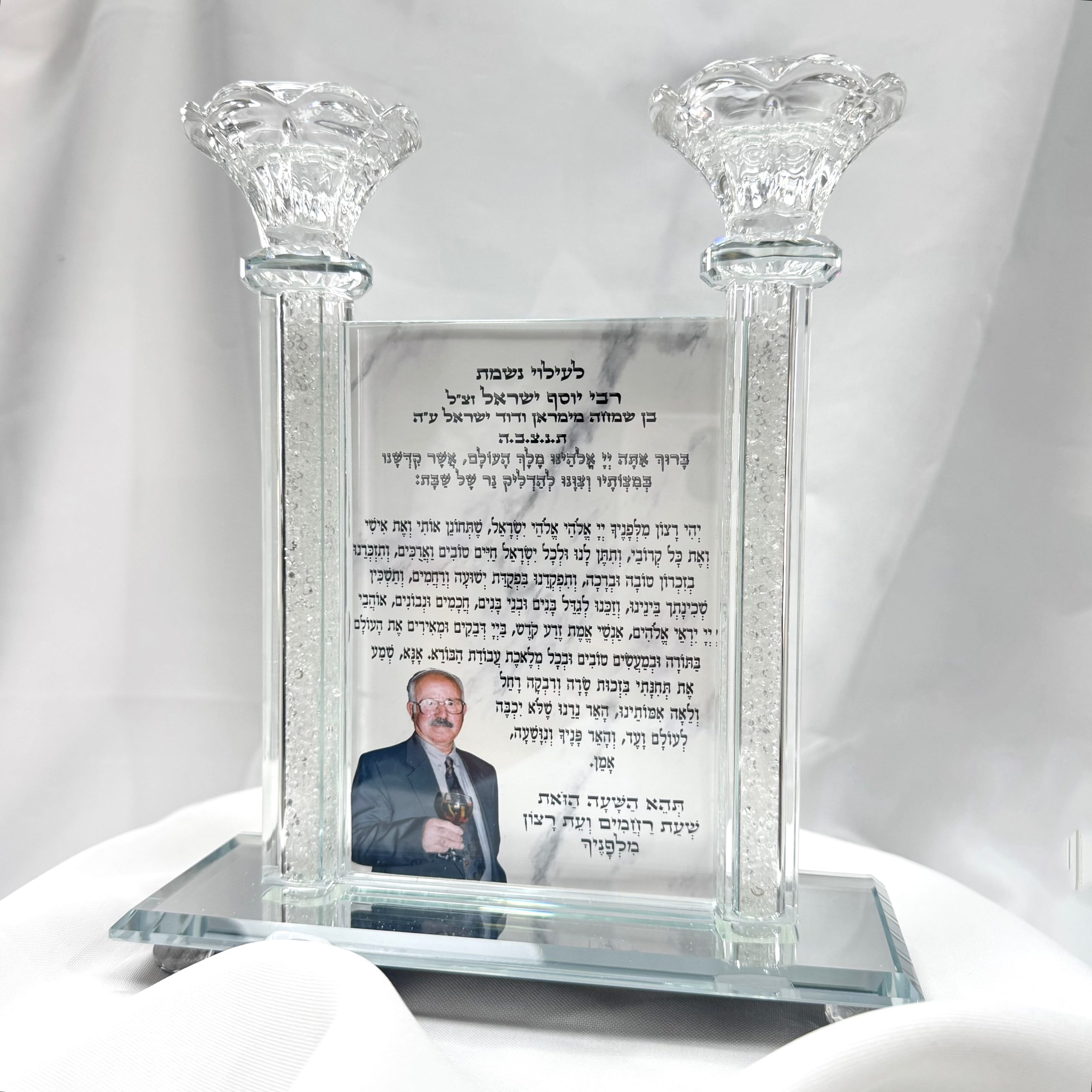 עשוי מקריסטל עם ברכת הדלקת נרות ובשילוב תמונה עם הקדשה לכבוד היקר/ה לליבכם.