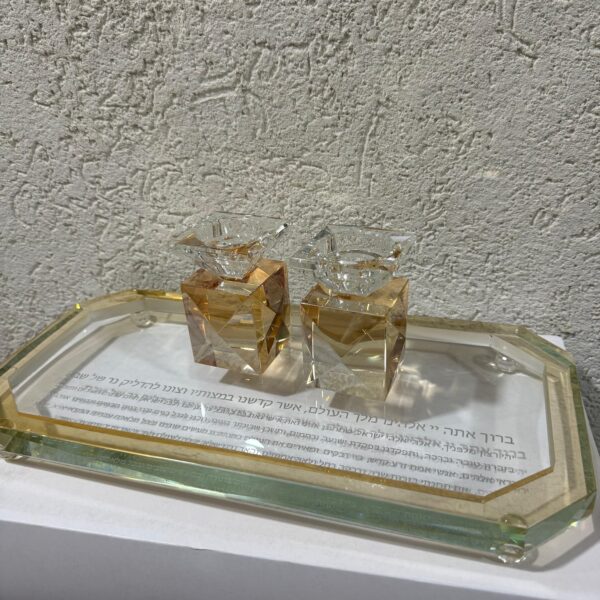 זוג פמוטי שבת ומגש מקריסטל בגווני זהב עם חריטת הדלקת נרות שבת.