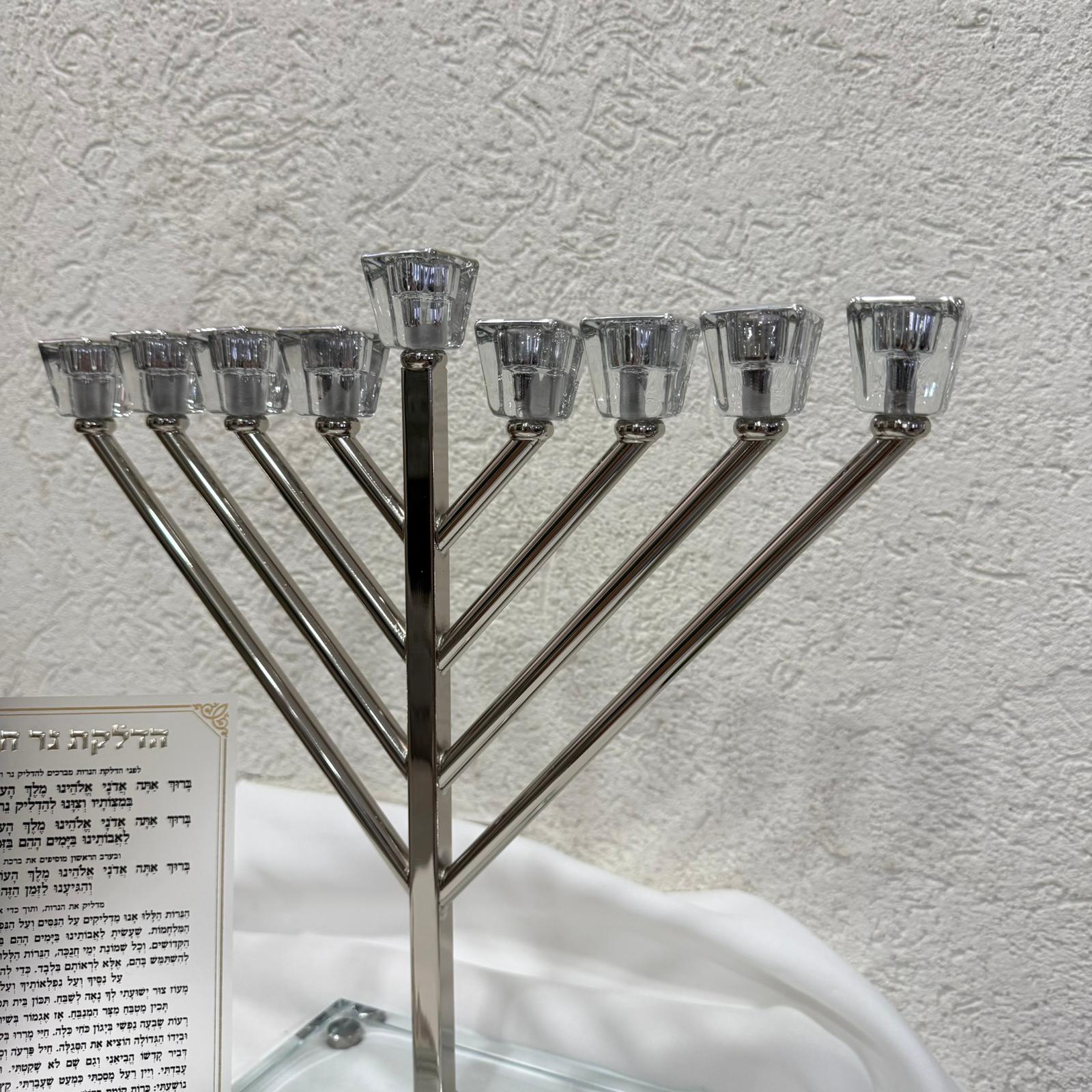 חנוכיה יוקרתית עשויה מתכת כסף וקני קריסטל כסופים.