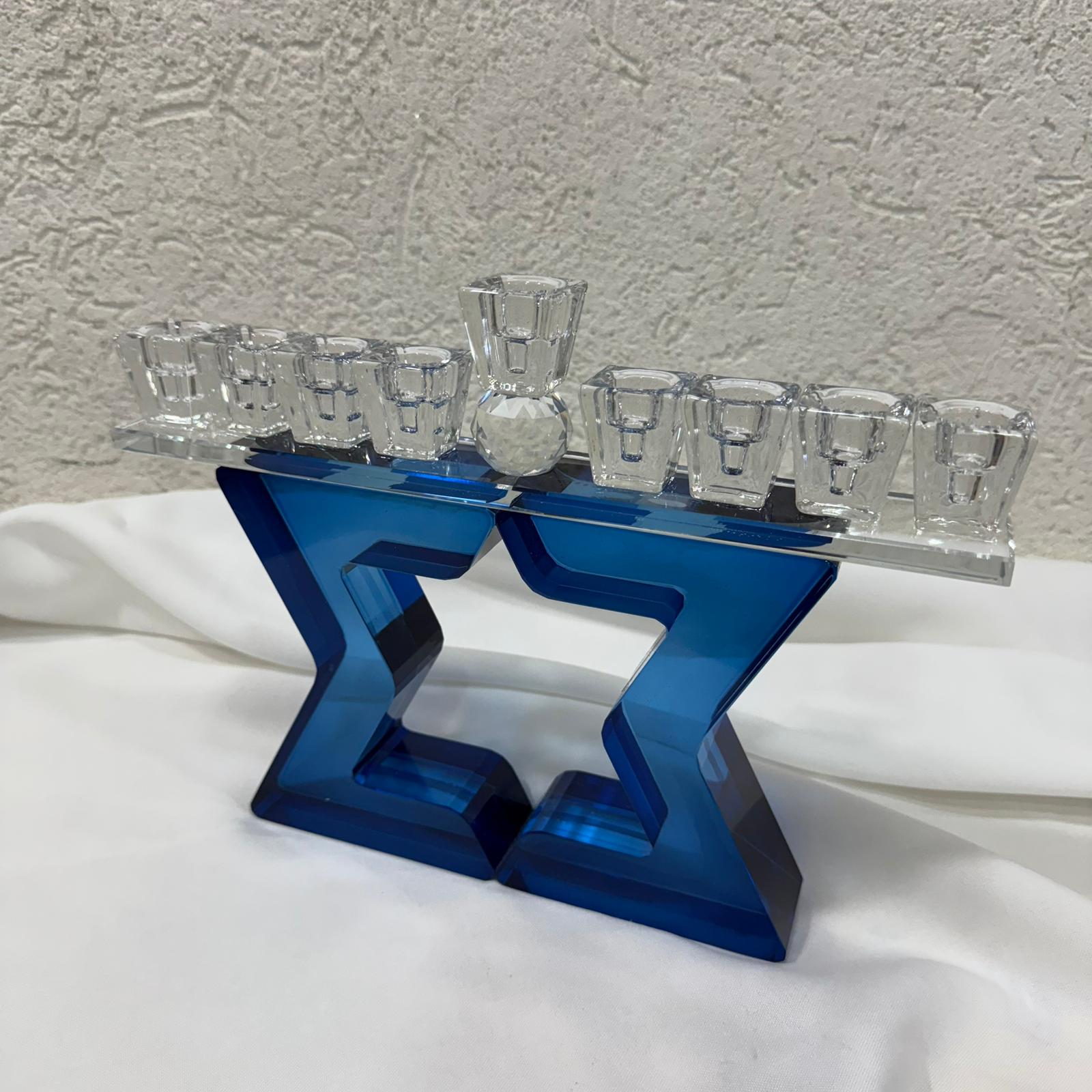 חנוכיה יוקרתית עשויה קריסטל בעיצוב מגן דוד גווני כחול.