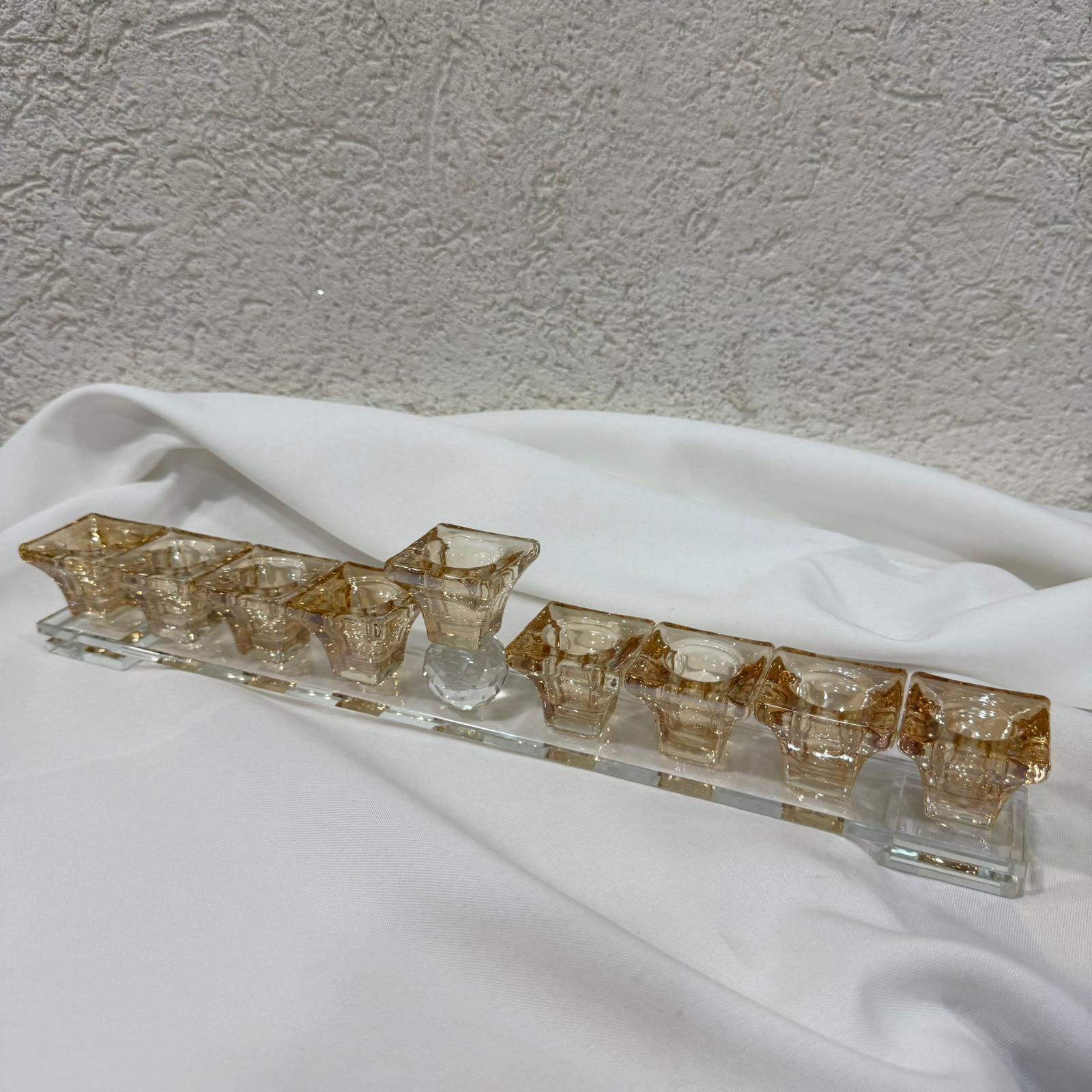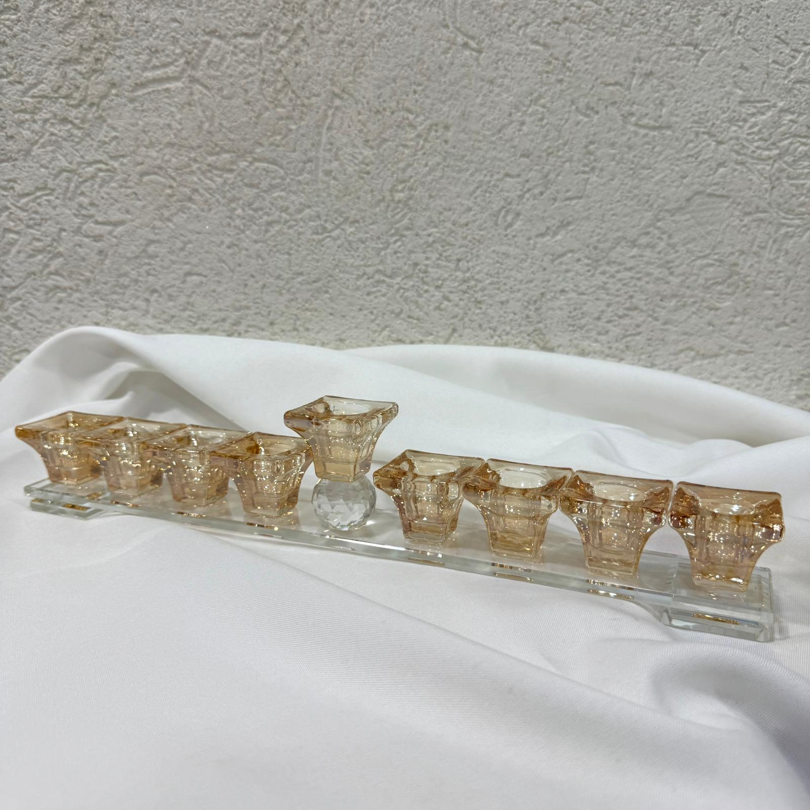 חנוכיה מהודרת מקריסטל, נמוכה בגוון מוזהב עדין.