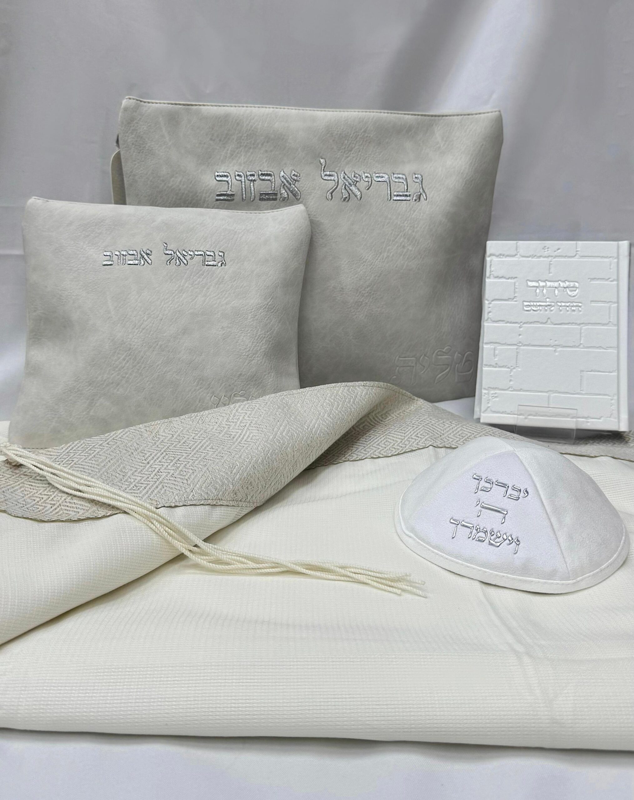 – סט כיסויים מהודר לטלית ולתפילין דמוי עור בתוספת רקמת שם.
