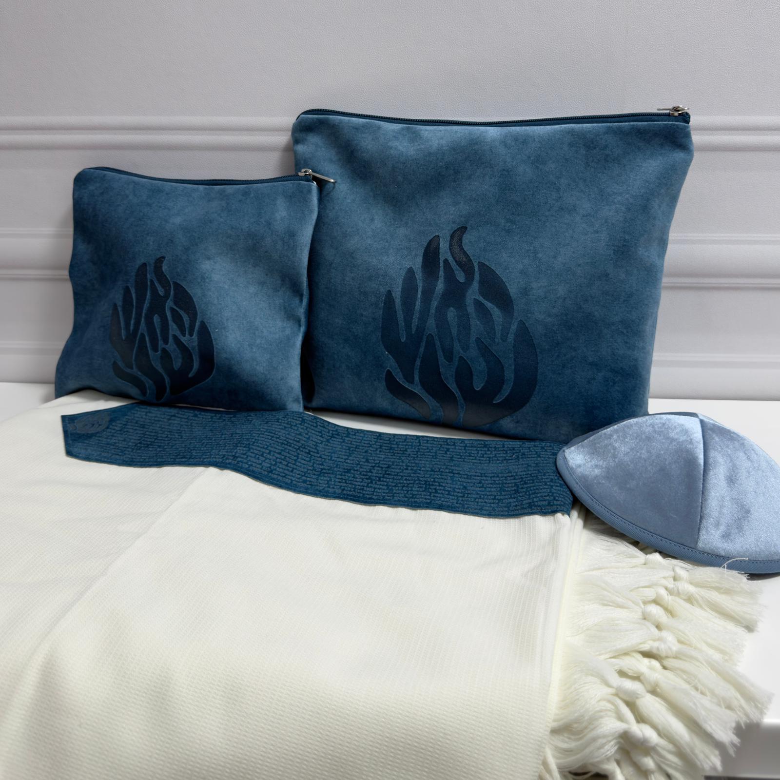 – סט כיסויים לטלית ולתפילין קטיפה-זמש האש שלי בתוספת רקמת שם.