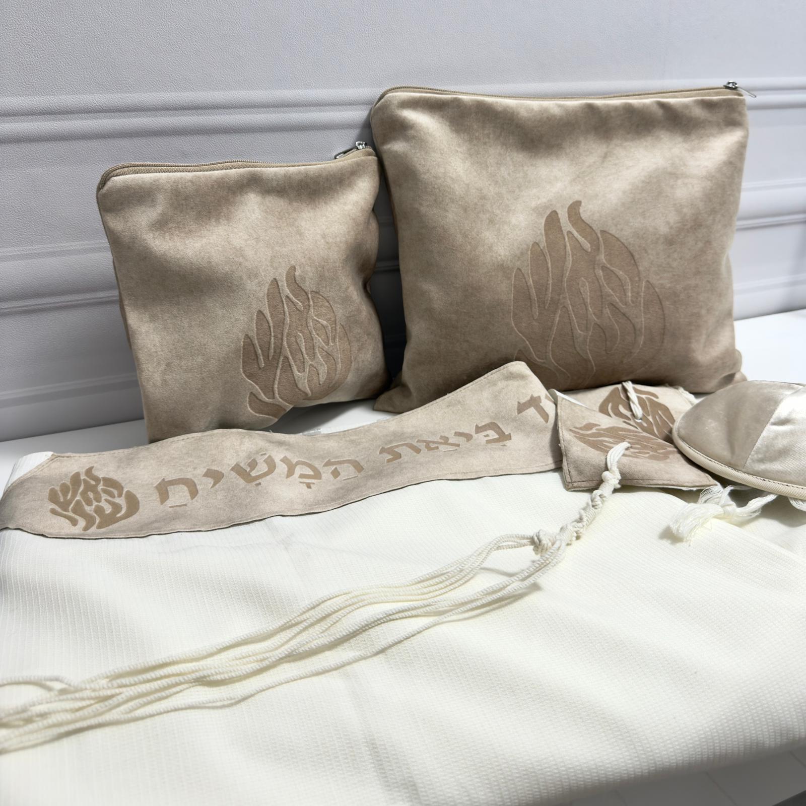 – סט כיסויים לטלית ולתפילין קטיפה-זמש האש שלי בתוספת רקמת שם.