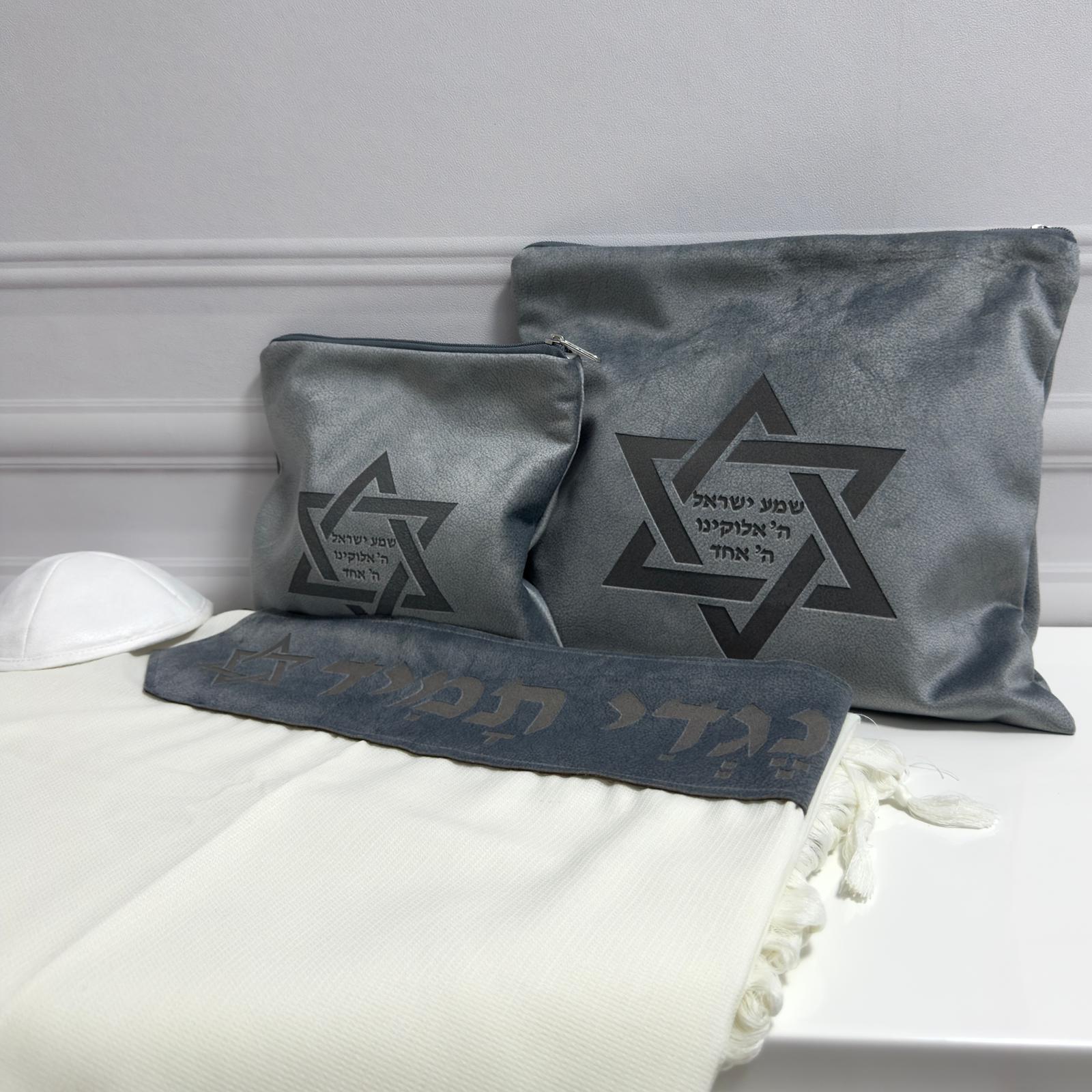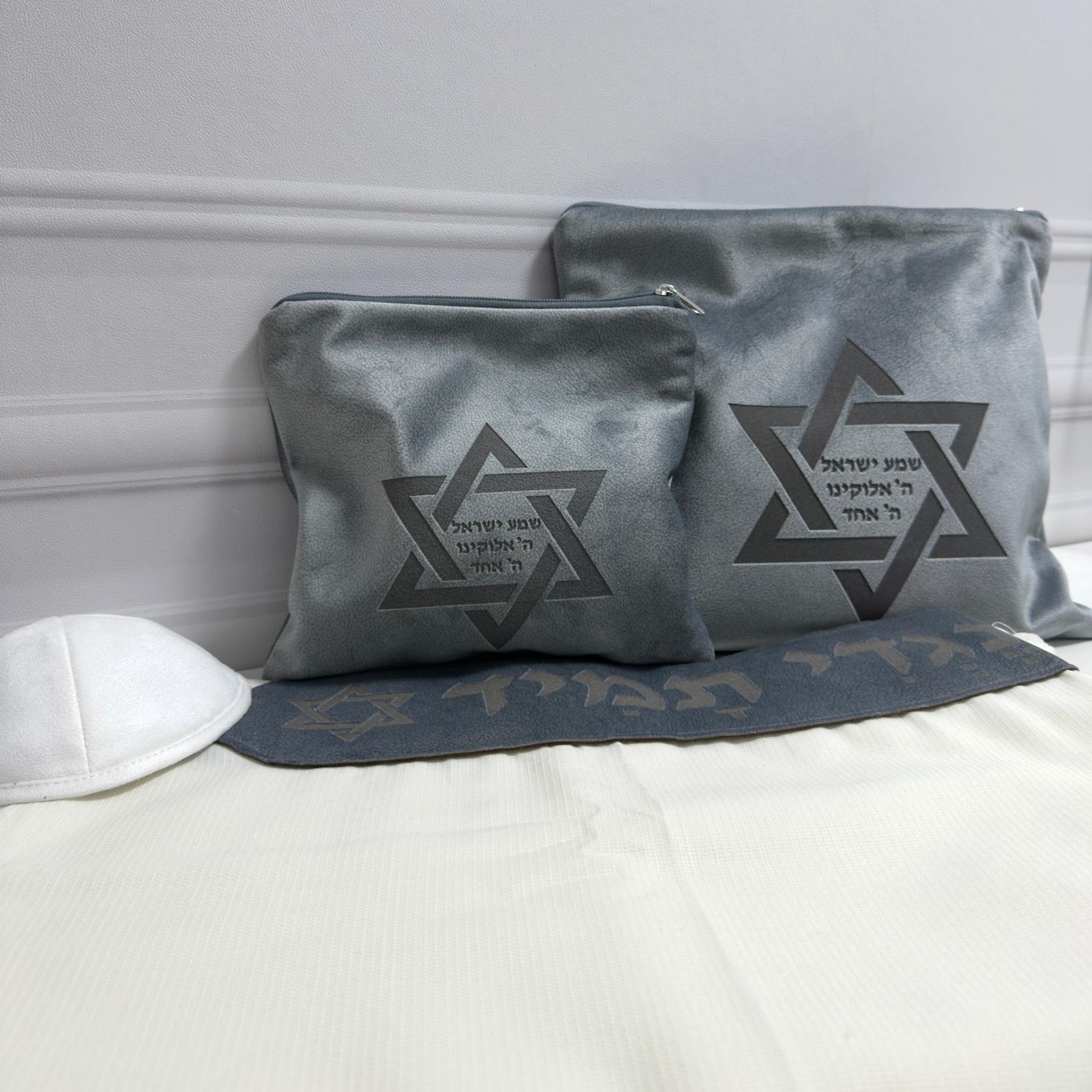 – סט כיסויים לטלית ולתפילין קטיפה-זמש מגן דוד ברכה שמע ישראל בתוספת רקמת שם.