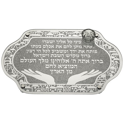מגש חלה יוקרתי עם מלחייה מזכוכית עבה בעיצוב "פותח את ידיך"