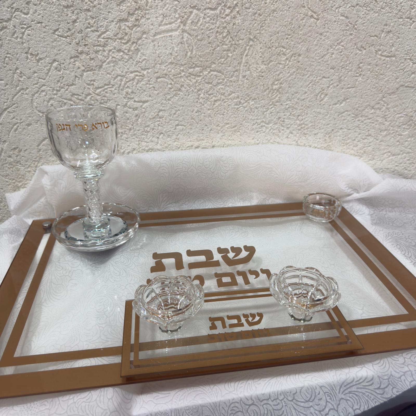 מגש חלה מהודר עם מלחייה, פמוטי שבת וגביע קידוש בגווני שקוף וזהב מיוחד.