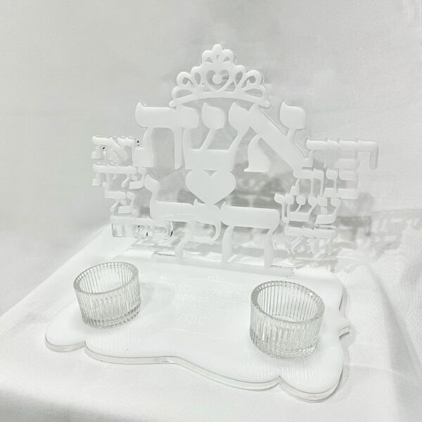 בחיתוך לייזר מפרספקס אשת חיל בשילוב גווני לבן ושקוף, מגיע עם זוג כוסיות לנרות.